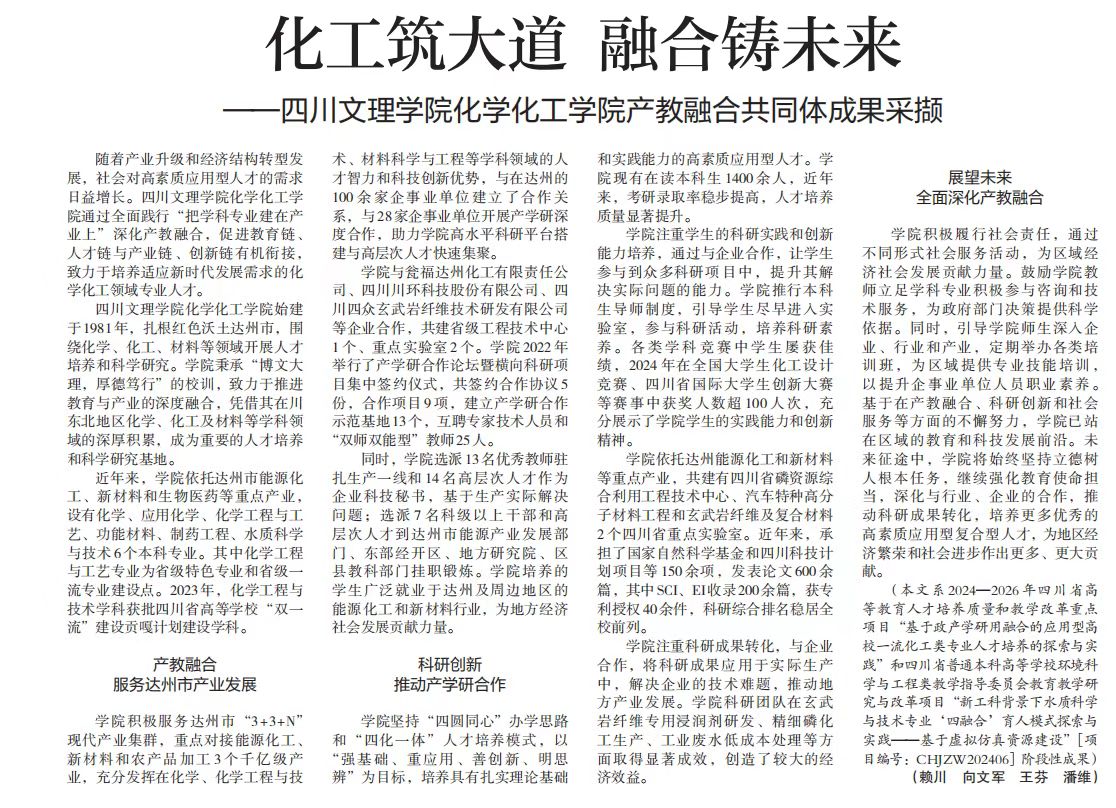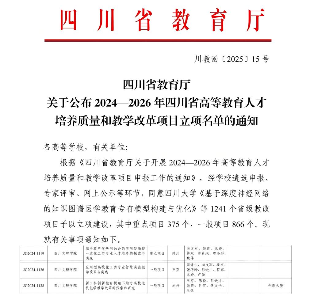 “地方应用型高校化工虚拟仿真教学创新实验室”成功入选教育部高等学校虚拟仿真教学创新实验室项目;“金属有机缓蚀剂的‘六位一体’综合创新实验设计与实践”获批省级创新性实验项目;另有《基于政产学研用融合的应用型高校一流化工类专业人才培养的探索与实践》等3个项目获2024-2026年四川省高等教育人才培养质量和教学改革项目立项,其中重点项目1项。