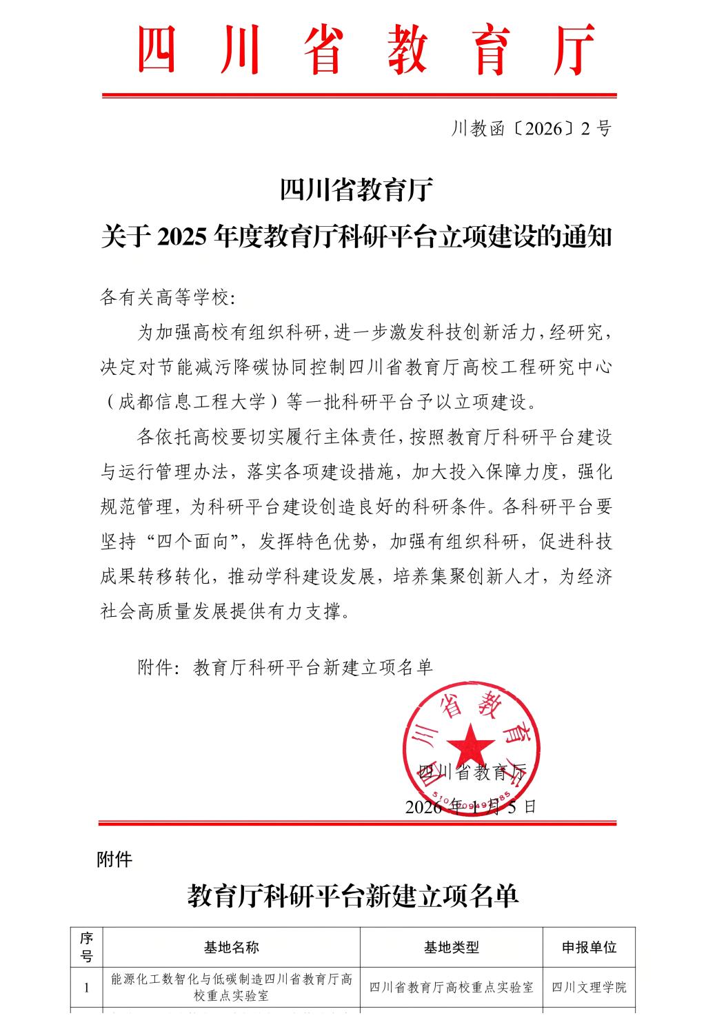以第一依托单位成功获批“能源化工数智化与低碳制造四川省教育厅高校重点实验室”,联合共建的“玄武岩纤维及复合材料重点实验室”获先进材料领域四川省重点实验室优化重整通过。