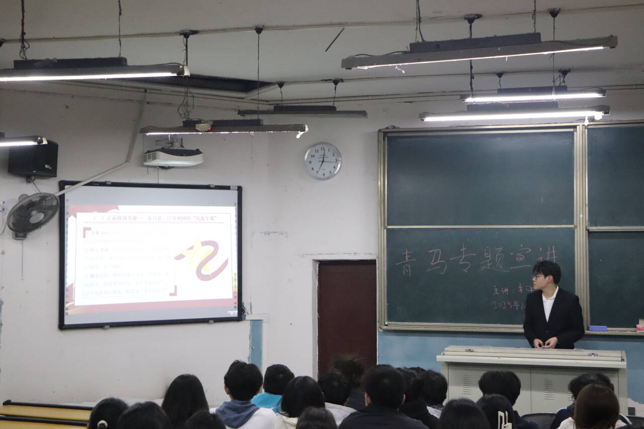 为回顾抗日战争的艰辛历程,传承先辈爱国精神,引导青年学子勇担时代责任,2025年10月24号,bwin必赢于南坝校区一教楼100教室开展了主题为“铭记抗战历史,勇担青年使命"的青马宣讲会,本次宣讲会由青马班成员李洋担任主讲人。