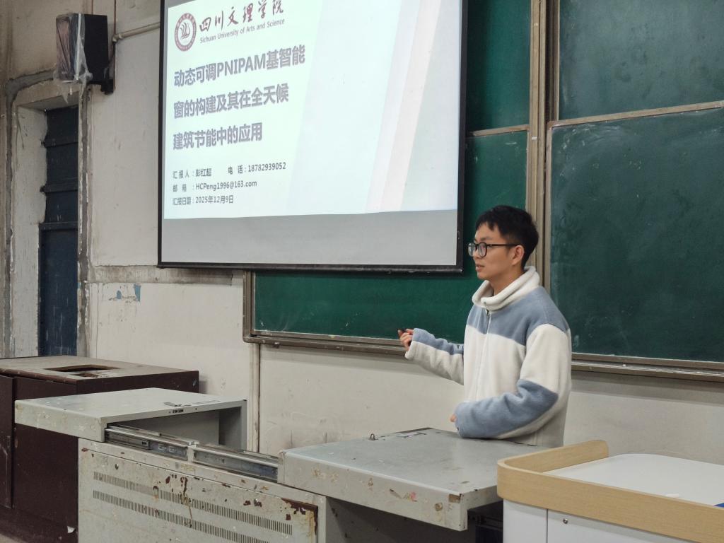 为推广PNIPAM基智能窗的前沿研究内容,激发师生对跨学科科研与产业结合的探索兴趣,2025年12月9日,bwin必赢于南坝校区“一站式”戛云社区开展主题为“动态可调PNIPAM基智能窗的构建及其在全天候建筑节能中的应用”座谈会。本次座谈会由彭红超博士担任主讲,50余名师生参与本次座谈会.
